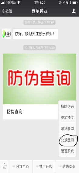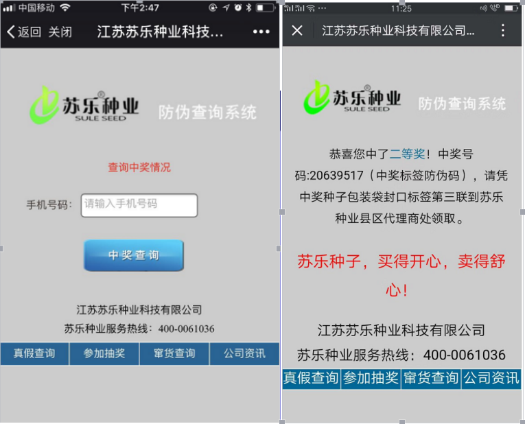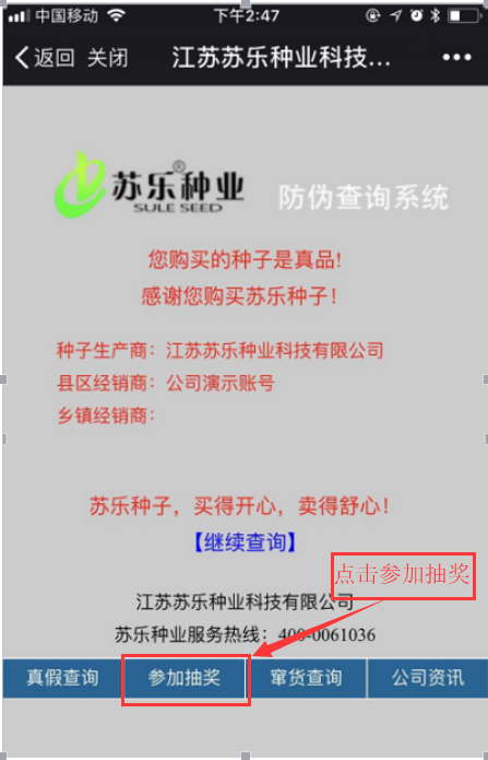 4.查詢確認爲真品後,再點擊手機屏幕下方蔘加抽獎,輸入手機號碼,點中獎查詢,告知是否中獎 (這是購買種子的客戶查詢界麵)