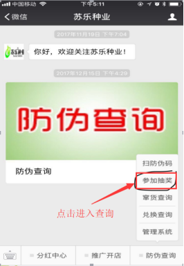 2.再點擊手機屏幕下方【蔘加抽獎】,提示【抽獎前必鬚進行防僞查詢】,然後進入蘇樂種業防僞查詢繫統